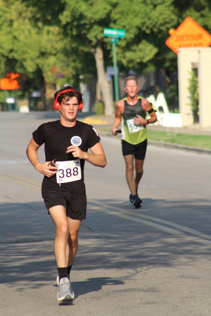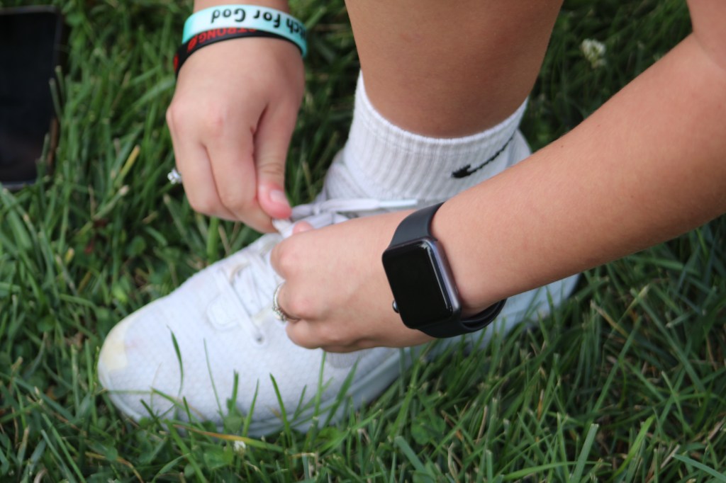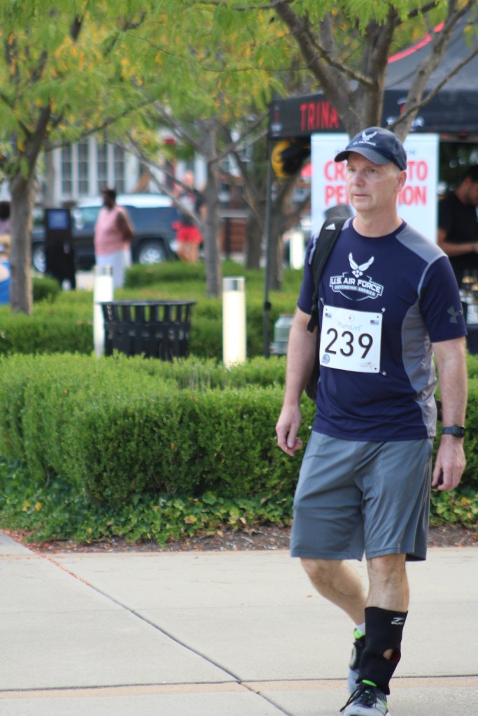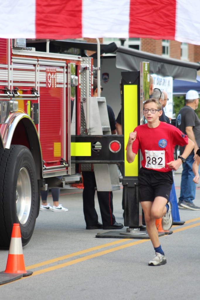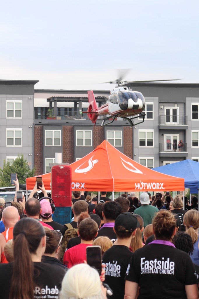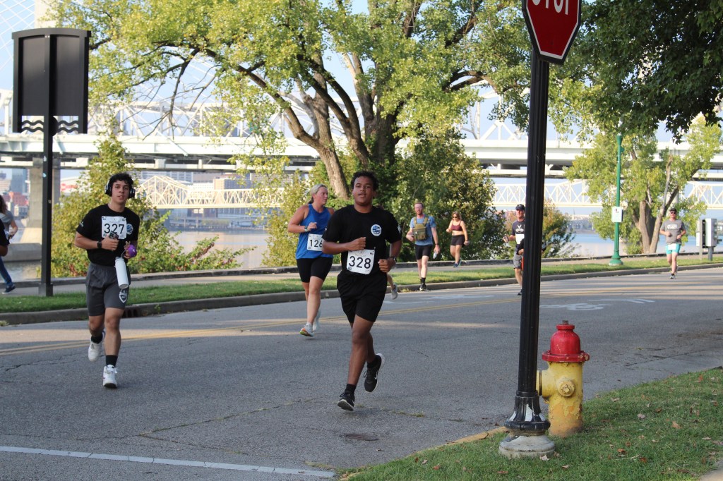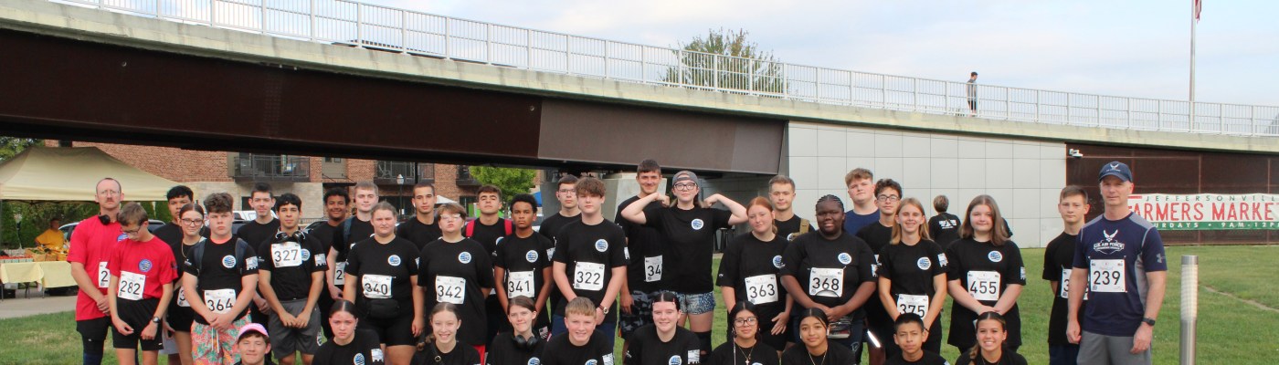 JROTC cadets minutes before the start of the annual Back Your Blue 5K on Sept. 21 that took place in Downtown Jeffersonville with a total participant count of 767.The team leader for the Greater Clark County Schools sponsorship, Colonel Bob Benning, finished the race in 171st place. Incentivising the cadets to try hard and run faster, he offered a uniform pass for those cadets that beat him in the race. “I think every year I’m a little bit slower, but it seems that the cadets get faster each year,” he said.Sophomore cadet Shelby Ramge loops her laces and ties a knot that will hopefully stay for another 3.1 miles, as she completed this race in 419th place.A minute before the racers line up behind the start line, some there to crush the race and be in the front, while others supported by walking behind, the local medevac team touches down on the grass.Master Sergeant Christopher Manley’s son, Joseph, takes charge in the very front for the first mile. He thought he was going to place in the top 30, while his dad thought he was going to be in the top 10. Final race results revealed Joseph placing 6th in the race overall.Junior Quintin Smith did not intend on running this race, but showed up anyway. He ended up placing 24th and before the race said his goal was to, “better myself and to get faster.”Senior Cadet Alexander Sampaio catches up to Senior Cadet Braylon Walker for the last block of the race. Sampaio placing in 161st and Walker one runner behind, finishing in 163rd place. Walker said, “I felt like I needed to run since it’s my last year.”