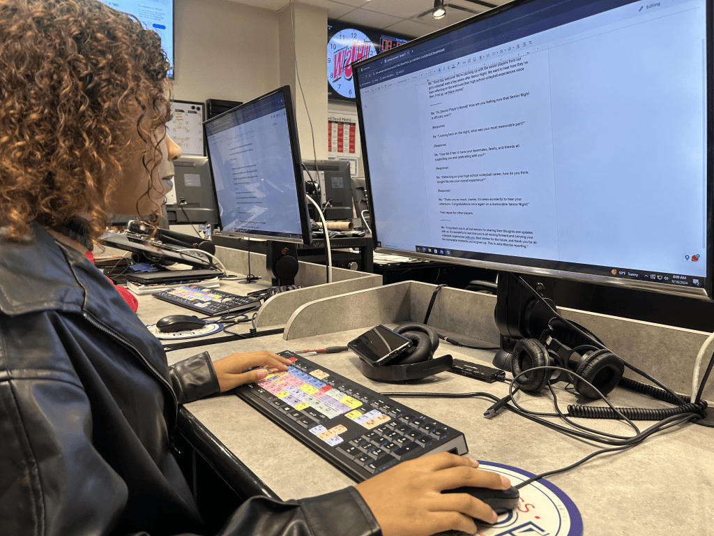 WJHI adviser Fred Cowgill instructs junior Elliot Swincher and his first-period class on the requirements for an upcoming project. This project requires students to write a script and have it prepared after the weekend. Photo by Ayianna Maddox. Swincher works on his project in the broadcasting studio. “I enjoy communicating with other people and learning the terminology about the computers,” said Swincher. Photo by Ayianna Maddox.WJHI media advisers Dave Callan and Cowgill often go around the room to make sure students are on the right track as sophomore Dane Watterson edits. There are sometimes technical issues, but they work with students to resolve them. Both Callan and Cowgill are in their first year at JHS. Photo by Ayianna Maddox.Senior Julia Monroe works on a script. “I enjoy learning more about editing and looking more into the professional world of reporting,” she said. Photo by Ayianna Maddox.