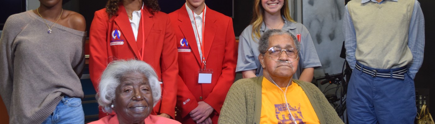 Taylor High School graduates Flora Clipper and Frank Baines join JHS Hyphen and WJHI journalists for an extensive interview Tuesday morning, Nov. 19, in the WJHI studio. Clipper graduated from Taylor High School in 1940, and Baines graduated in 1952. Photo by Ifrah Daber. Clipper and Baines with Hyphen and WJHI journalists and JHS student ambassadors, including junior Teagan Cofie, senior Avani Doogarsingh, sophomore Tristan Cooley, senior Andrea Campbell, and senior Tristan Darvin. Clipper and Baines discussed the history of Taylor High School in an extensive interview, sharing details about Clark County history and the school that was constructed to educate Clark County’s African American students. Photo by Ifrah Daber. Clipper and Baines meet with principal Pam Hall and WJHI instructor Dave Callan during their visit on Tuesday, Nov. 19. Photo by Ifrah Daber. Clipper and Baines with Hyphen and WJHI journalists Eliot Swincher and Ifrah Daber. Photo by Andrea Campbell. Basketball coach Sherron Wilkerson and senior Tre Singleton take a moment to greet Clipper and Baines. Baines played on the Taylor High School basketball team. Photo by Ifrah Daber.Baines models a Taylor High School shirt, which includes the school colors. Photo by Ifrah Daber.