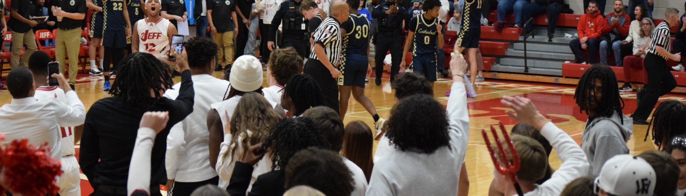 Freshman MaKenna Taylor eyes the net during the girls’ basketball game against Cathedral on Nov. 30. The game kicked off an afternoon of basketball last Saturday, as both the girls’ and boys’ varsity teams played and defeated Cathedral. Photo by Madison Pritchard. Senior Kelis Dansby shoots a free throw. Photo by Madison Pritchard.Senior Makenzie Mason blocks a shot during the JHS-Cathedral game. Photo by Madison Pritchard.Junior Maizy Smith waits for a rebound from a free throw. Photo by Madison Pritchard.Senior guard Gilly Polk and the rest of the starting line-up wait with head coach Sherron Wilkerson before they are announced. Photo by Madison Pritchard. The fall Homecoming court stands before the ceremony, which took place during halftime of the boys’ basketball game against Cathedral. Homecoming had been postponed from earlier in the year by bad weather. Photo by Madison Pritchard. Seniors Romier Hunter-Lawrence and Maddie Hargett react after they are announced as Homecoming king and queen during halftime of the boys’ JHS-Cathedral basketball game. Photo by Stella Siewert.Seniors Romier Hunter-Lawrence and Maddie Hargett crowned homecoming king and queen during halftime of the JHS-Cathedral game. Homecoming festivities had been delayed from earlier in the school year due to weather. Photo by Maddie Pritchard. Senior guard Michael Cooper scores two of his 29 points in the season opener against Cathedral High School on Saturday, Nov. 30. The Red Devils won 67-65 on a night that included a 49-39 win for girls’ basketball over Cathedral. Photo by Kirk Owen. Senior P.J. Douglas boxes out Cathedral senior Aidan Hughes. Photo by Madison Pritchard. Students celebrate with senior P.J. Douglas at the end of the JHS boys’ game with Cathedral to end an afternoon of wins and homecoming festivities. The Red Devils won the game 67-65. Students were warned by principal Pam Hall on Monday, Dec. 2 to not storm the court in future games. Photo by Madison Pritchard.