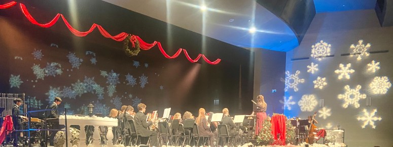 The band gathers on stage at the beginning of Winter Fantasy, the annual holiday musical program that combines the talents of many JHS musicians. Photo by Elliot Swincher.