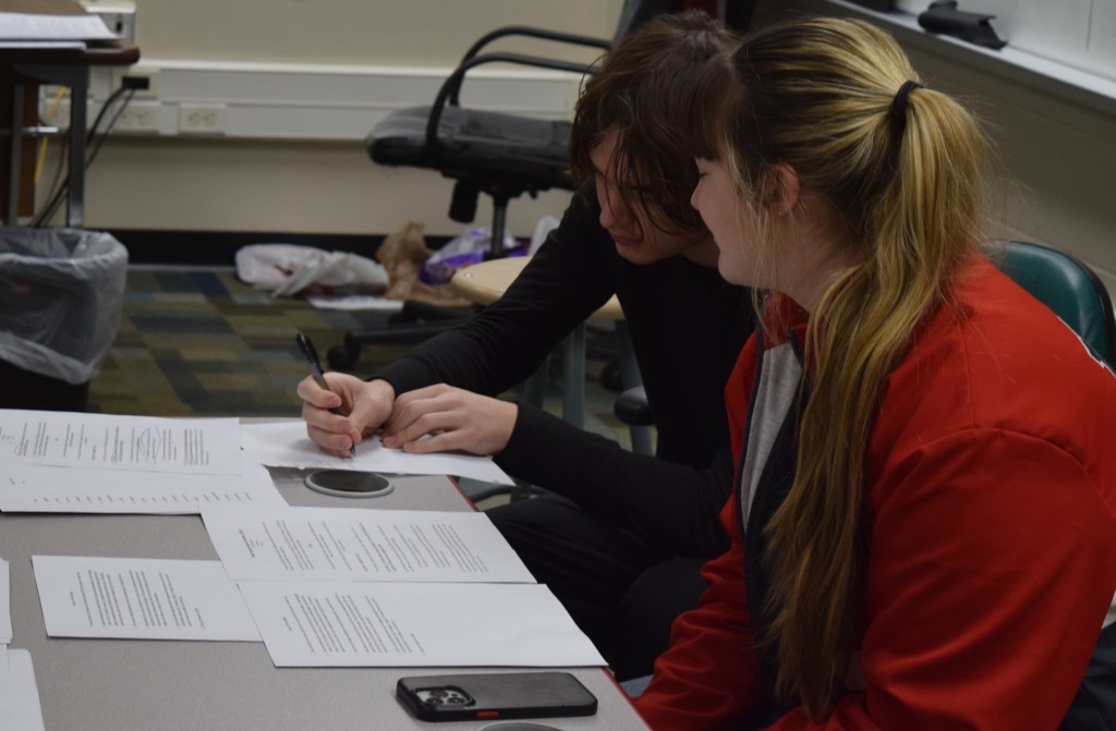 Seniors Violet Fondrisi and Jackson Callis work during the Mock Congress in Drew Davis’s first-hour AP Government class. Photo by Kaiden Helton. AP Government teacher Drew Davis gives instructions to his first-period class, including senior Cooper Turk-Gagel during their Mock Congress. Photo by Kaiden Helton. Seniors Collin Crouch, Jonas Newland, Hayden Smith, Evan Cooper, and Emily King take notes on legislation during the Mock Congress in sixth-hour AP Government Thursday afternoon, Jan. 30. Photo by Elliot Swincher.Senior Tristan Darvin, elected Speaker of the House, leads the Congressional ceremonies in Drew Davis’s sixth-hour AP Government class. Students in Davis’s classes were creating a Mock Congress. Photo by Elliot Swincher.