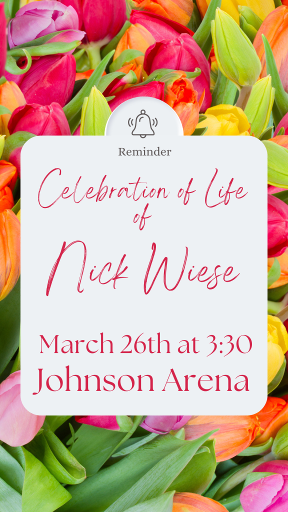 24 Mar 2025 by jhshyphen Wiese celebration of life this Wednesday at 3:30 p.m. in Johnson Arena Share this: Click to share on X (Opens in new window) X Click to share on Facebook (Opens in new window) Facebook Like Loading...