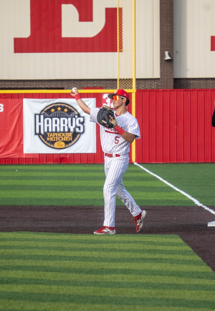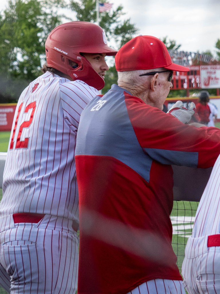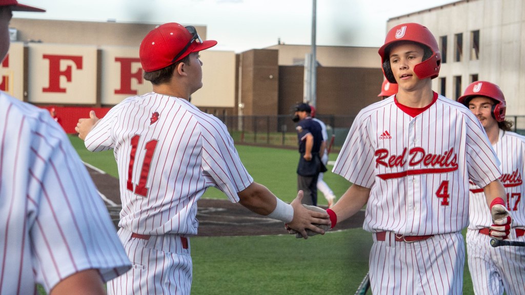 Sophomore Preston Hart throws a pitch to the opposing New Albany Bulldogs. The Red Devils were victorious in the 11th inning 8-7 as they won the Hoosier Hills Conference on Saturday. Photo by Magdalene Conrad. Sophomore AJ Seifert gets a hit for the Red Devils. Photo by Magdalene Conrad.Junior Cole Singleton chats with assistant coach Wayne Stock while preparing to hit. Photo by Magdalene Conrad. Sophomore first baseman Cash Waters throws in to pitcher Preston Hart after getting an out for the Red Devils. Photo by Magdalene Conrad. Sophomore Braylon Gray takes a moment after stealing second base. The Red Devils won the HHC championship 8-7. Photo by Magdalene Conrad.Freshman Aidan Toler welcomes sophomore AJ Seifert and junior Leo Hutchings back in the dugout after Seifert led the Red Devils to score. Photo by Magdalene Conrad. Junior Leo Hutchings is welcomed back into the dugout after scoring a run for the Red Devils. Photo by Magdalene Conrad.Senior Carter Williams hypes up the crowd after a huge win against the New Albany Bulldogs in the HHC championship game. The Red Devils won 8-7 in the eleventh inning on Saturday, May 17. The Red Devils will face Providence this Wednesday, May 21 at 6 p.m. Photo by Magdalene Conrad.