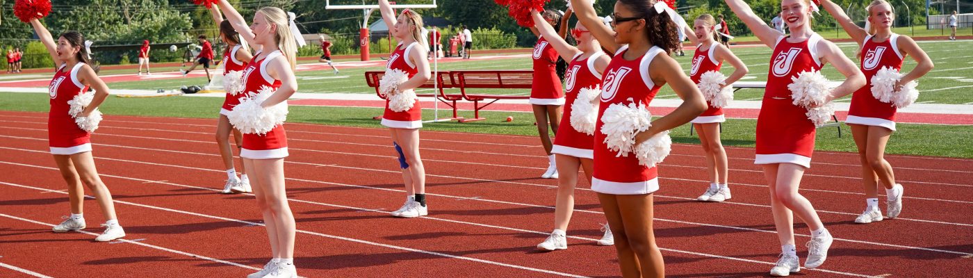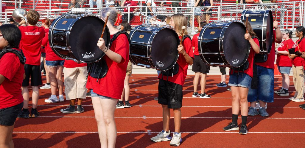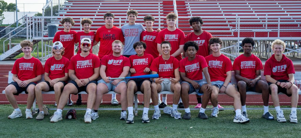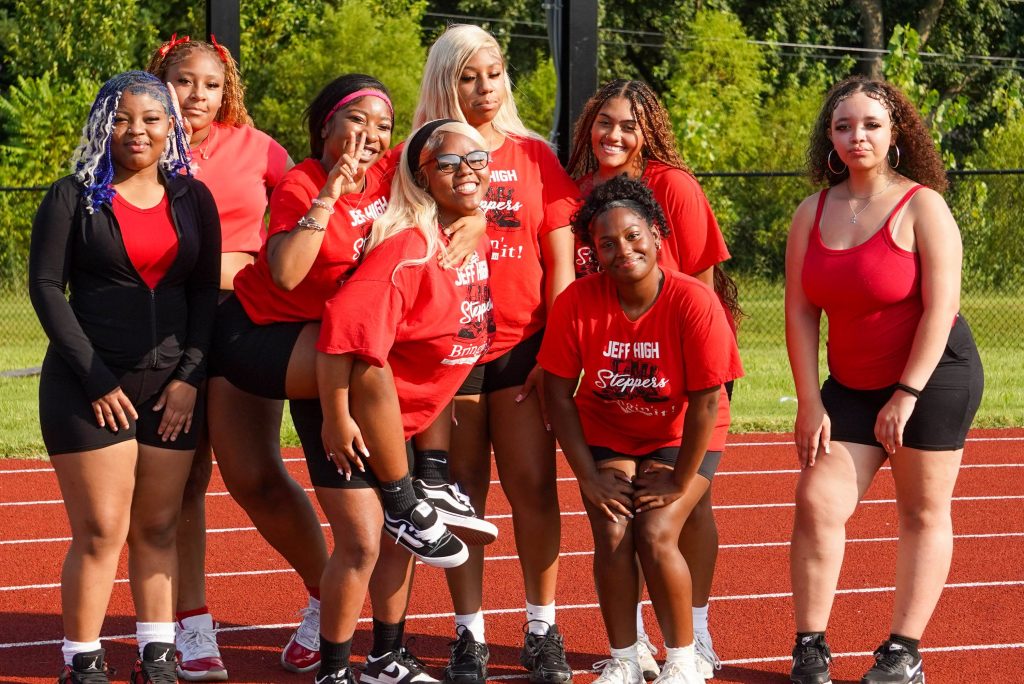 The Jeff High Step Team represents the school at Thursday’s Community Pep Rally. Photo by Magdalene Conrad. Junior Stella Siewert participates in the swim and dive interactive station. Photo by Magdalene Conrad. The cheerleaders perform for the crowd. Photo by Magdalene Conrad. The Jeff High cross country runners pose for a photograph. Photo by Magdalene Conrad. The Jeff High band performs at the Community Pep Rally on Thursday, August 7. Photo by Magdalene Conrad. Seniors Brody Fulkerson, Quintin Smith and Maverick McAllister enjoy the Community Pep Rally, which took place on Thursday, August 7 from 6-8 p.m. on Bill Ware Field. Photo by Magdalene Conrad. The girls’ soccer coaches Rachel Foster and Emily Foster soak in the sun at Thursday’s Community Pep Rally. Photo by Magdalene Conrad. Red Devil baseball teammates represent the team at this past Thursday’s Community Pep Rally. Athletes and coaches from multiple Jeff High sports greeted the community at the event. Photo by Magdalene Conrad.Sophomore Aaliyah Flowers and the cheer team perform stunts and ignite school spirit for the crowd. Photo by Magdalene Conrad.