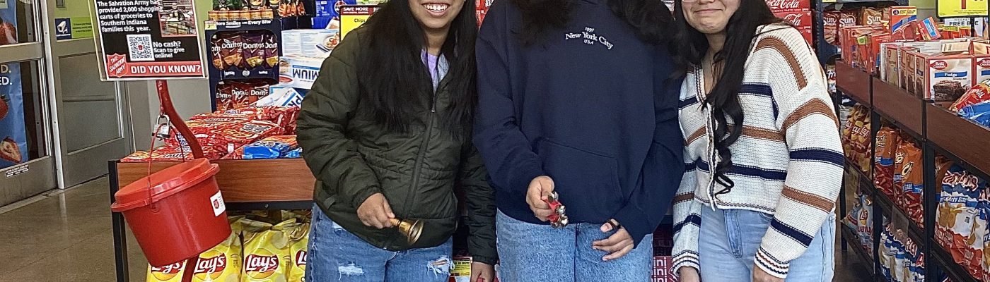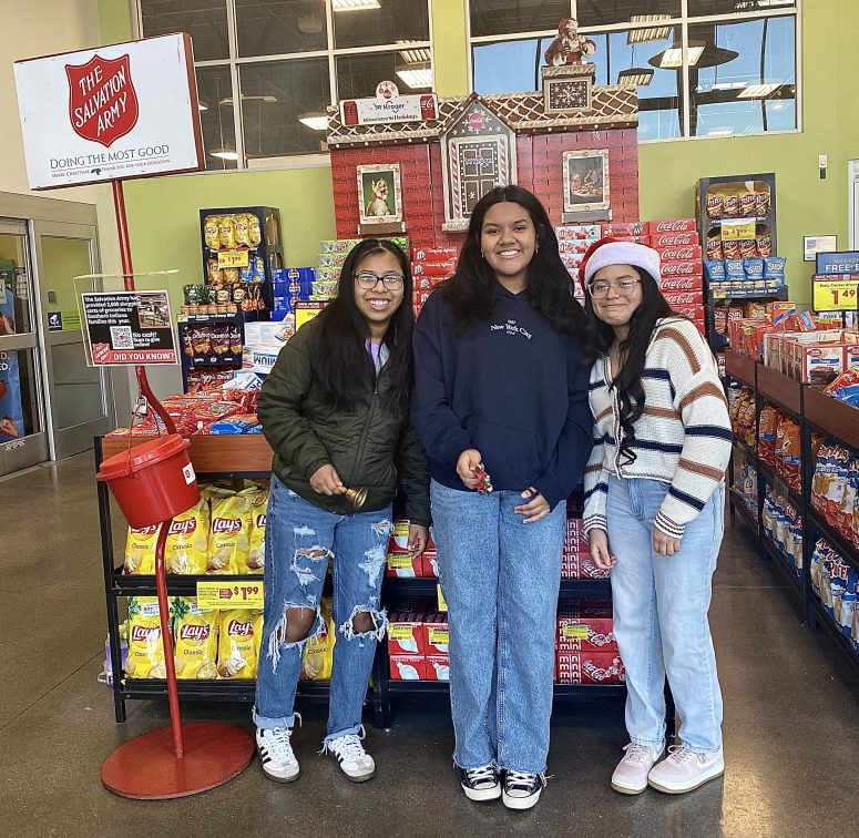 Anchor club members Ariana De La Cruz Guerrero, Eliani Schulz, and Alison Hernandez-Estrada showing leadership through their contribution of “Ringing of the Bells” on Dec 12, 2024. Anchor Club leaders are currently planning projects for the new school year. Photo by Areli Hernandez Romero.