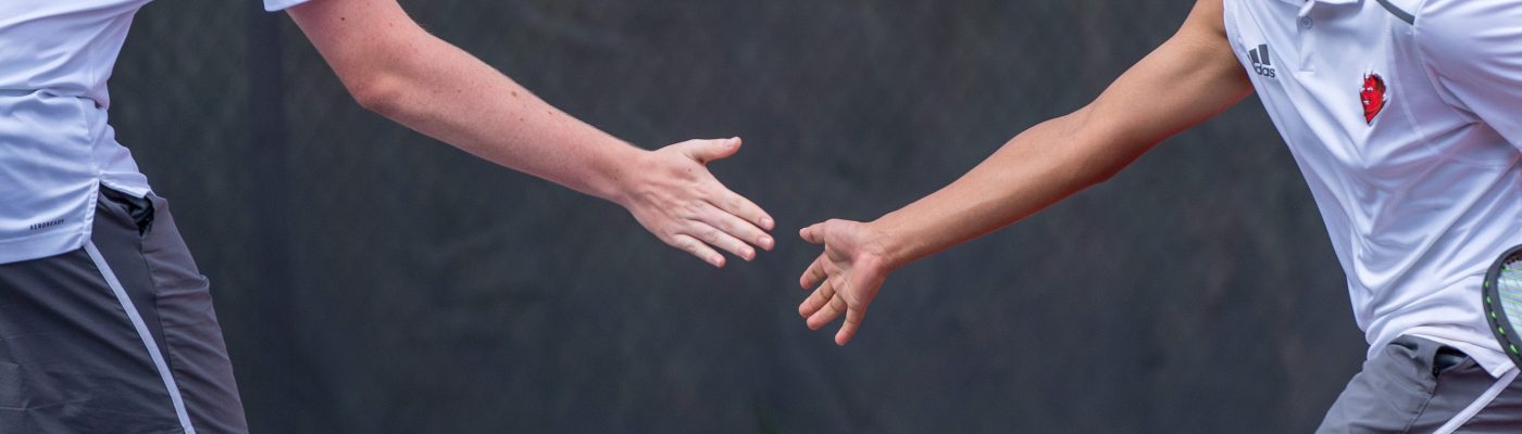 Junior Austin Gazaway and junior Kaden Westbay walk toward the baseline. The Red Devils were playing in an invitational against several other tennis teams on Saturday, August 23. Photo by Parker McCloskey.Junior Ethan Moran and junior Tyler Braitling talk about the last play. Photo by Parker McCloskey.Junior Jared Garcia jumps and hits the ball towards his opponent. Photo by Parker McCloskey. Juniors Tyler Braitling and Ethan Moran perform a handshake. Photo by Parker McCloskey. Junior Austin Gazaway walks towards the baseline. Photo by Parker McCloskey. Junior Ethan Moran looks towards the ball. Photo by Parker McCloskey.
