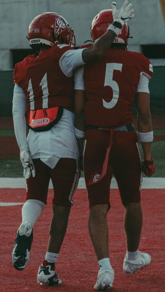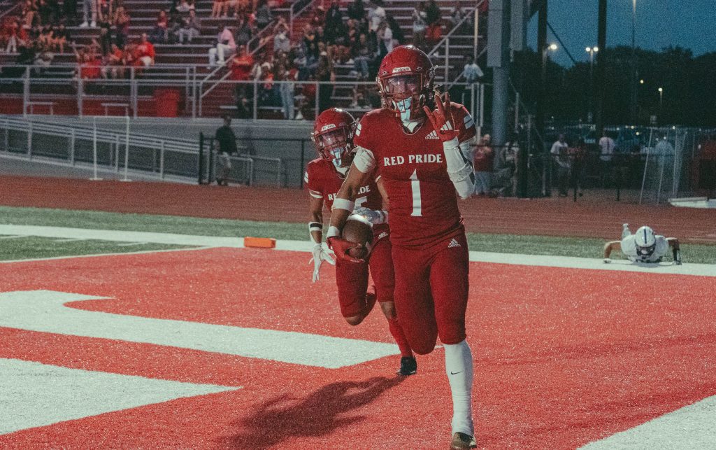 Junior Nation Roe-McBroom holds back the Seymour defense to score a touchdown for the Red Devils. JHS defeated the Owls 20-6 and will face Bedford North-Lawrence this Friday. Photo by Magdalene Conrad.The offensive line snaps the ball to junior Benji Rice for an attempt at a touchdown against the Seymour Owls on Friday. The Red Devils won 20-6, picking up the first win of the season. Photo by Magdalene Conrad.Senior Caleb Bale prepares for the matchup against the Seymour Owls this past Friday. The Red Devils won 20-6. Photo by Magdalene Conrad. Senior Kurion Thompson points at the camera as he goes to the locker room at halftime. Photo by Magdalene Conrad.Coach Tranere Nelson hugs junior Nation Roe-McBroom after a touchdown for the Red Devils. Photo by Magdalene Conrad.Junior Benji Rice poses for the camera after a touchdown against the Seymour Owls. Photo by Magdalene ConradSenior Bryce Grant and junior Nation Roe-McBroom celebrate a touchdown together. Photo by Magdalene Conrad.