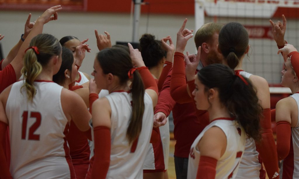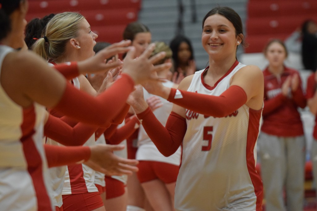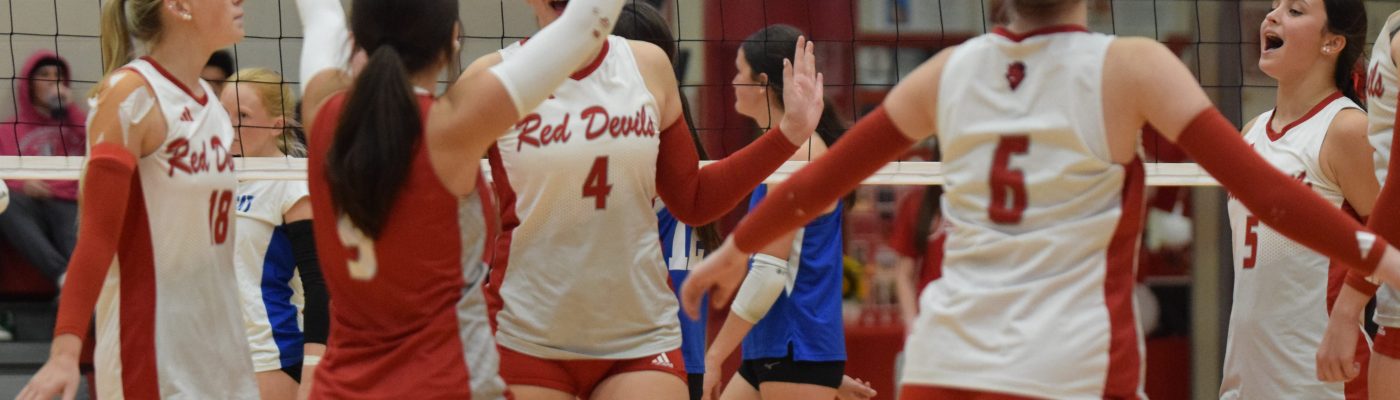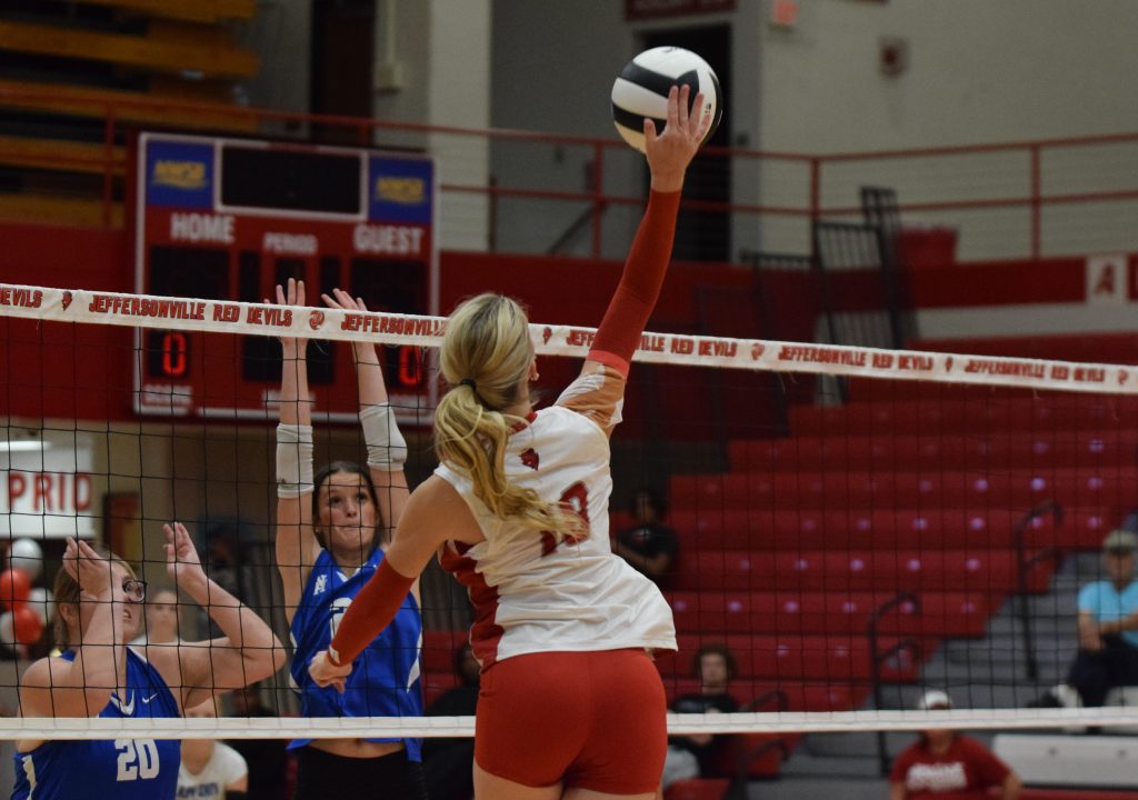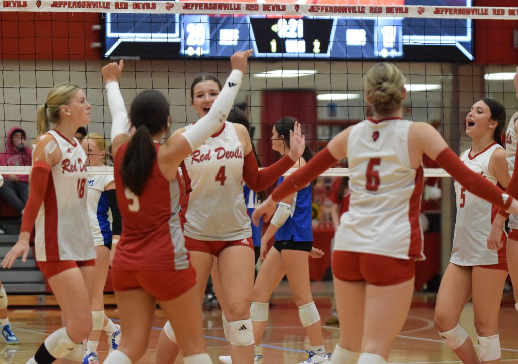 Senior Riley Dobson claps her teammates before the game starts on Monday night. The Red Devils defeated North Harrison 3-2 on Senior Night. Photo by Malachi Conrad.Senior Aleah Byers holds the ball getting ready to serve. Photo by Malachi Conrad. Senior Jenna Kelley spikes the ball over the net against North Harrison and goes for the kill. Photo by Malachi Conrad.Senior Addison Fouts prepares her serve during the senior set. Photo by Malachi Conrad.Sophomore Joslin Wilson talks with her teammate. Photo by Malachi Conrad. Senior Rylee Brown prepares to serve the ball to North Harrison. JHS won 3-2 Monday night on Senior Night. Photo by Malachi Conrad. The Red Devils break from a timeout using their signature hand sign. Photo by Malachi Conrad.Senior Riley Dobson serves the ball. Jeffersonville went on to beat North Harrison 3-2. Photo by Malachi Conrad.Senior Addison Fouts and junior Mattie Barker celebrate after a successful point against North Harrison Monday night. Photo by Malachi Conrad.The Red Devils come together and celebrate after winning their second set against North Harrison. Photo by Malachi Conrad.