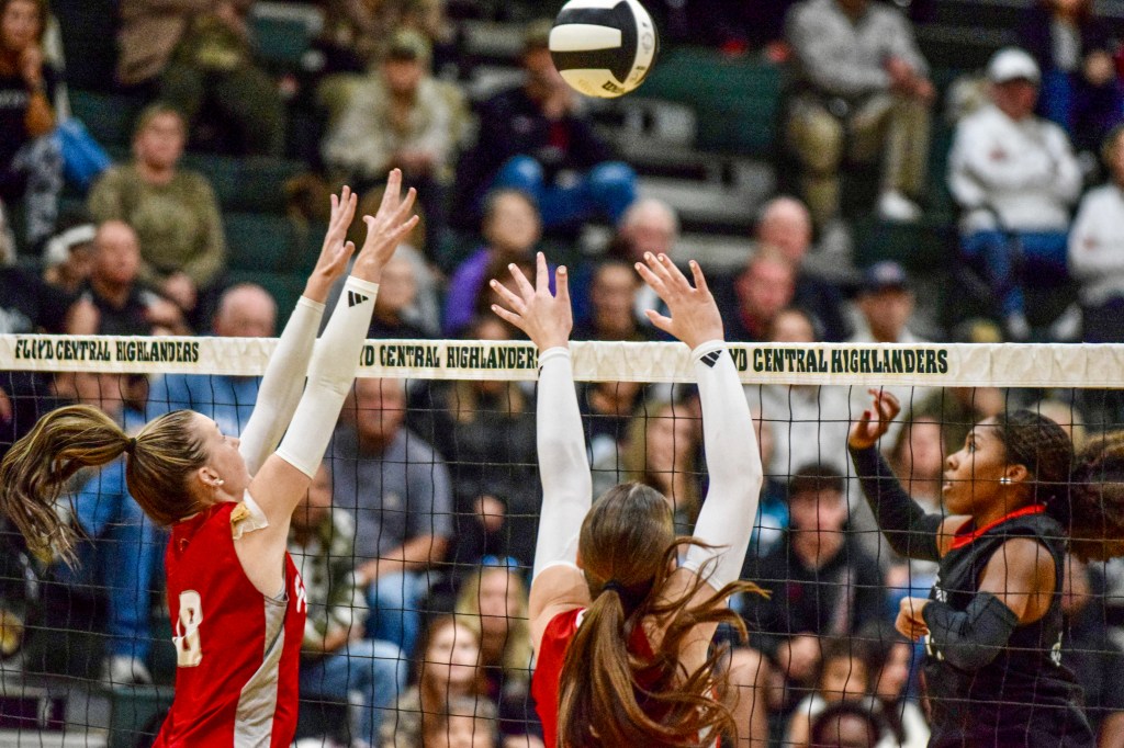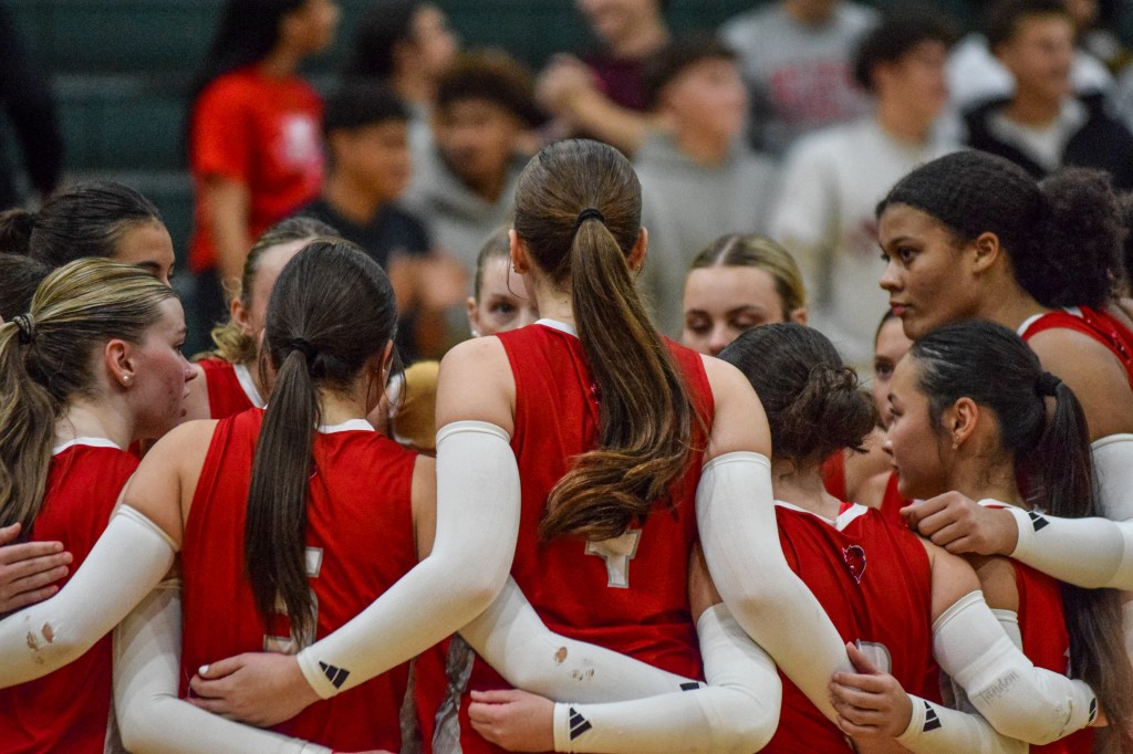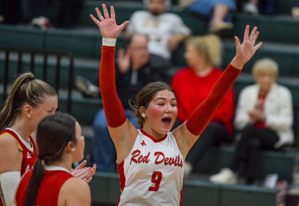 Senior Addison Fouts high-fives her team before the game during the sectional game against New Albany. The Bulldogs defeated JHS 3-0. Photo by Malachi Conrad.Jeffersonville Red Devils talk to each other before the game against New Albany. The sectional match-up took place at Floyd Central High School. Photo by Malachi Conrad Senior Jenna Kelley and sophomore Joslin Wilson try to block the ball against the Bulldogs. Photo by Malachi Conrad.Senior Riley Dobson prepares to serve the ball against New Albany. Jeffersonville lost 3-0 in the sectional game. Photo by Malachi Conrad.Junior Mattie Barker looks off into the distance. Photo by Malachi Conrad.Junior Mattie Barker celebrates the point she just won against New Albany. Photo by Malachi Conrad.Senior Lola Rodriquez attempts to spike the ball during the sectional game against New Albany. Photo by Malachi Conrad.