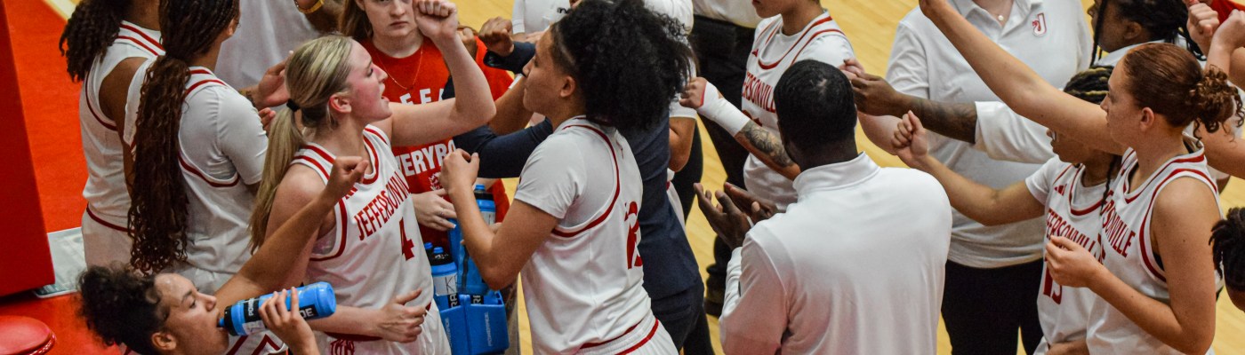 Senior Kiya Boatwright and sophomore Lorelei Darling watch the pregame introduction at the JHS game against Providence. Photo by Malachi Conrad.Junior Maliyah Poindexter looks at the inbounder. JHS defeated Providence 68-61 Tuesday night at Johnson Arena. Photo by Malachi Conrad. Senior Kelis Dansby shoots a mid-range shot over her Providence defender. She scored 13 points in the game. Dansby signed with Division 1 Louisiana Lafayette on Tuesday. Photo by Malachi Conrad.The JHS cheer team with senior Mallory Mattingly performs during a timeout of the JHS-Providence game on Tuesday. Photo by Malachi Conrad. Sophomore Makenna Taylor runs the ball up the floor in the second quarter against Providence. Taylor had 23 points in the game. Photo by Malachi Conrad.Sophomore Makenna Taylor inbounds the ball to her team during the JHS-Providence game. Photo by Malachi Conrad.Sophomore Jazlyn Bryant tries to move the ball around under defensive pressure from the Pioneers. Photo by Malachi Conrad.The Red Devils hype themselves up to finish the game against Providence strong. JHS capitalized on 23 Providence turnovers to rally and win 68-61 in the second half. They are now 2-2 and play Jennings County and Cathedral during Thanksgiving break. Photo by Malachi Conrad.Head coach Taylor Sykes reacts to a play on the court during Tuesday’s game against Providence. JHS defeated the Pioneers 68-61 after rallying in the second half. Photo by Malachi Conrad.