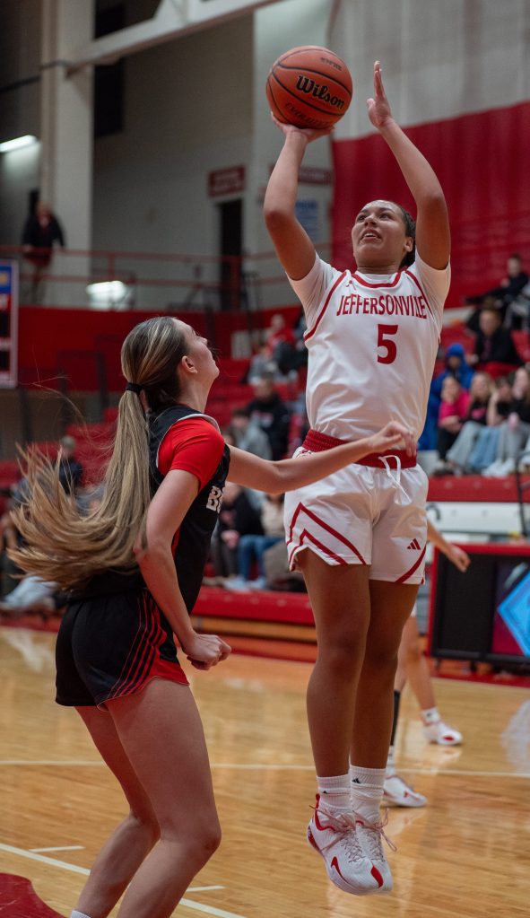 Sophomore MaKenna Taylor shoots over her defender. Photo by Malachi Conrad. Sophomore Alicia Mangrum shoots a 3-pointer. Bordon won 58-55 against Jeff on Dec. 2. Photo by Magdalene Conrad.Senior Maizy Smith shoots a wide-open 3-pointer. Photo by Malachi Conrad.
