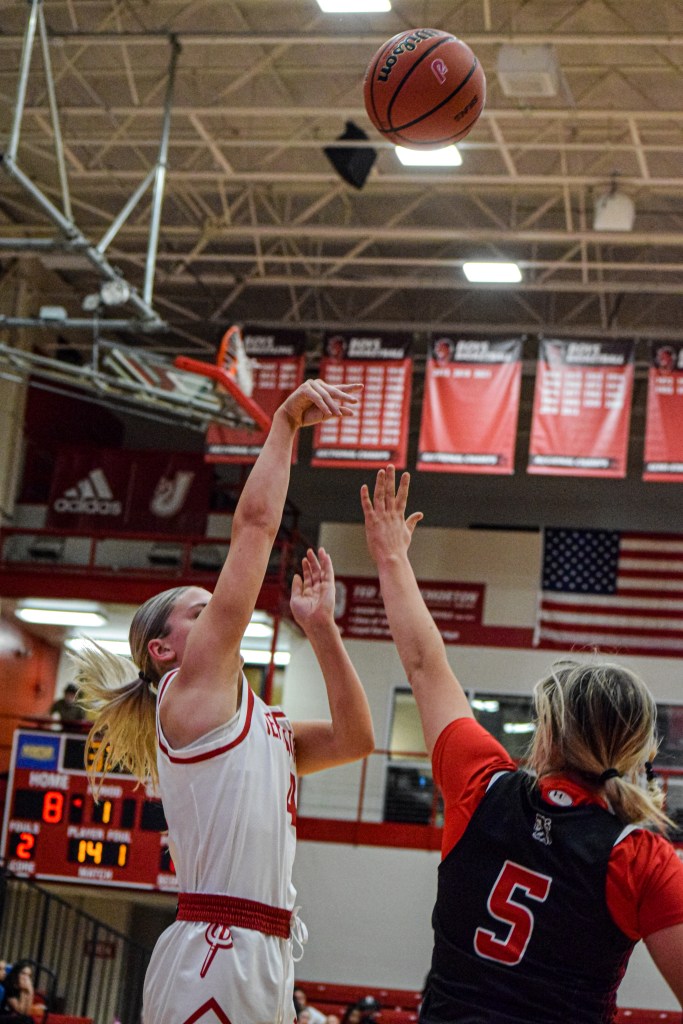 Sophomore Makenna Taylor shoots a 3-pointer over the Borden defense. Photo by Magdalene Conrad.