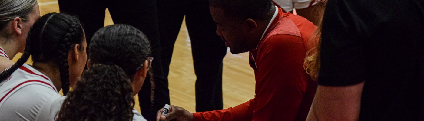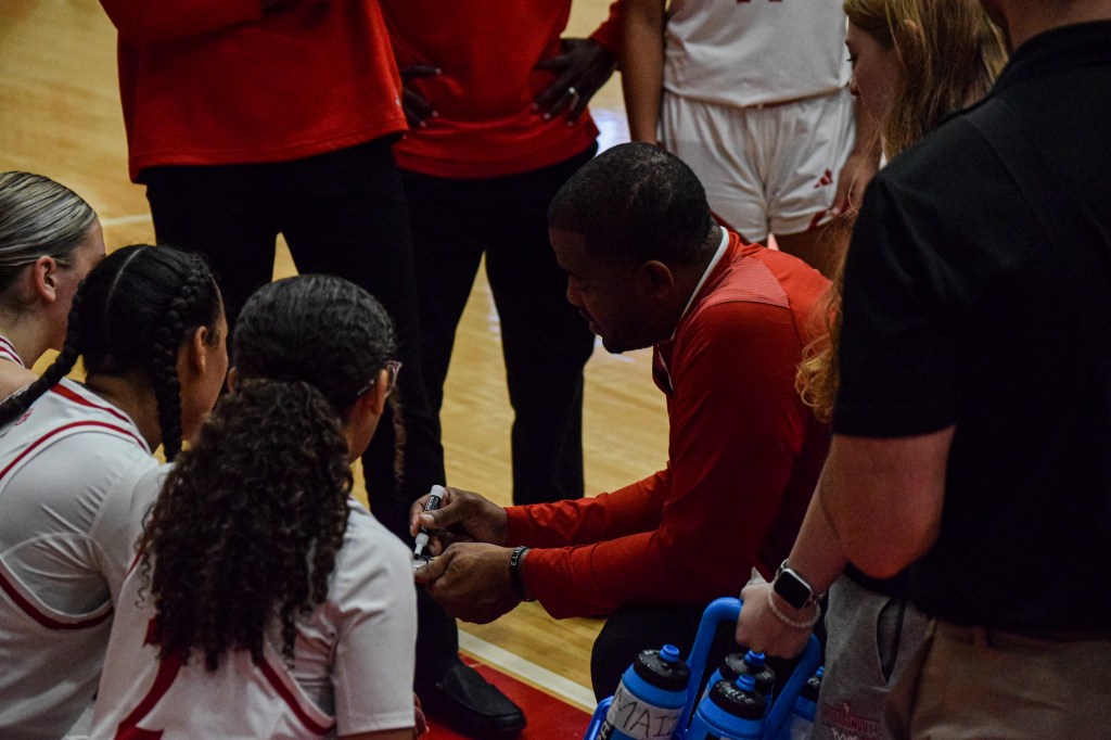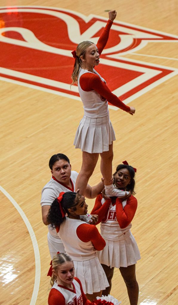 Senior Maizy Smith shoots a mid-range shot in a crucial fourth-quarter play against Borden. Photo by Magdalene Conrad.Sophomore Alicia Mangrum tries to break through contact for the layup. Photo by Magdalene Conrad. JHS cheerleaders perform during a timeout in the third quarter. Photo by Malachi Conrad. Interim head coach A.J. Moye shows the team his play and gives advice. This is his debut game for the Lady Red Devils. He also serves as JHS athletic director. Photo by Malachi Conrad. Senior Kelis Dansby signals to run a play late in the game. Photo by Malachi Conrad.