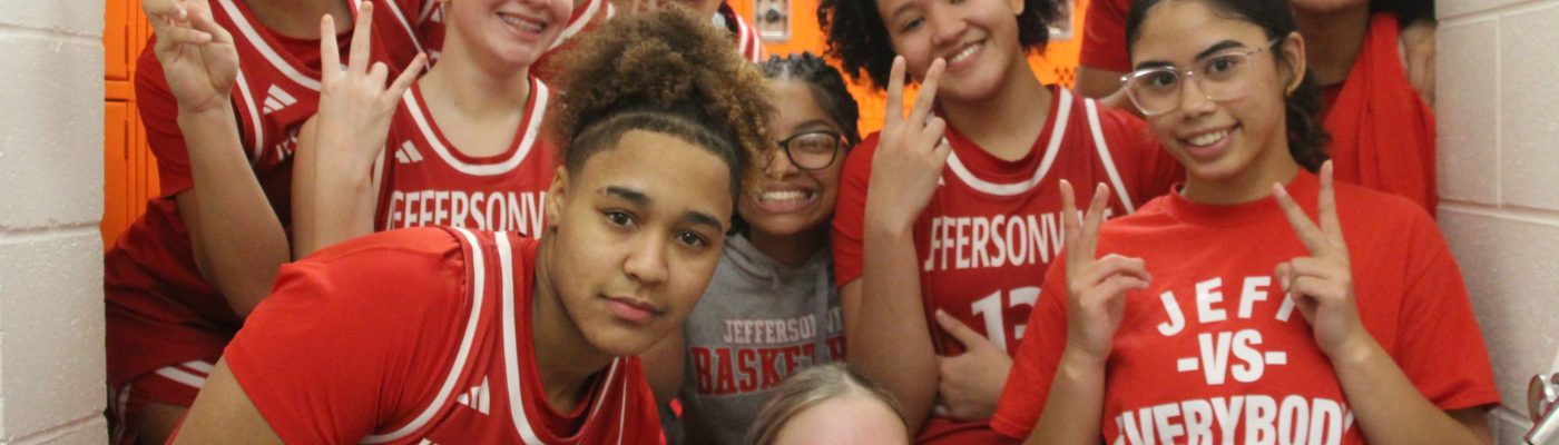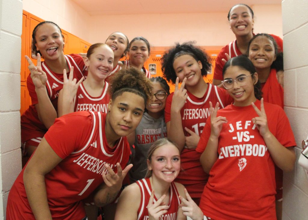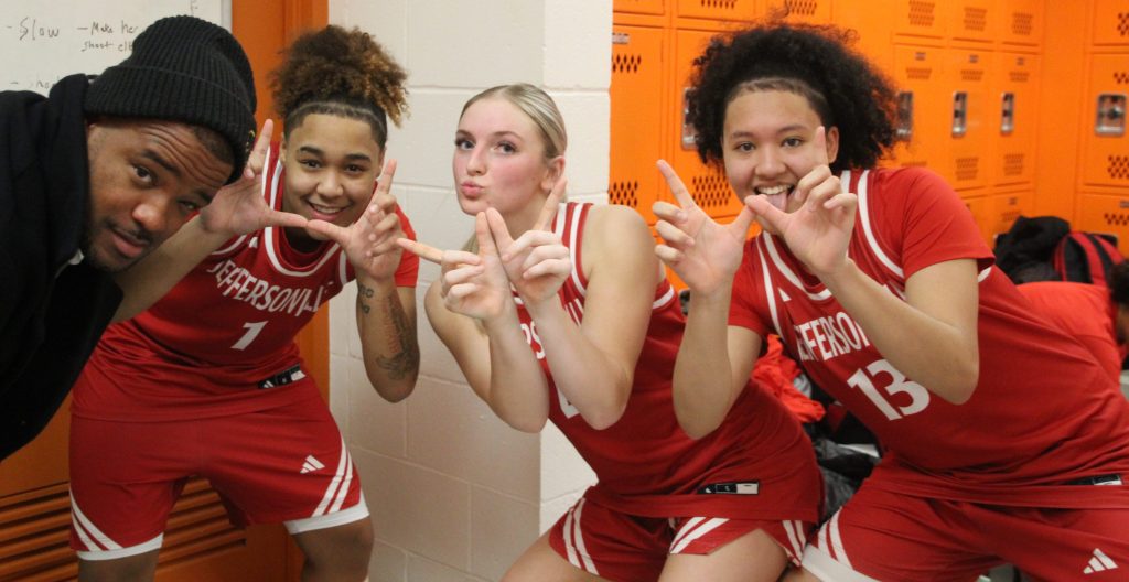 Senior Maizy Smith inbounds the ball to senior Kelis Dansby during the Red Devil game against Columbus East last Saturday. JHS won 61-31. Photo by Gabrielle Watkins. Senior Maizy Smith dives for the ball with senior Kelis Dansby and Columbus East players. Photo by Gabrielle Watkins.The JHS Red Devils celebrate their 61-31 victory over Columbus East last Saturday. JHS plays Charlestown tonight at home. Photo by Gabrielle Watkins.Senior Kelis Dansby and sophomores MaKenna Taylor and Alicia Mangrum celebrate with interim coach and athletic director A.J. Moye after the 61-31 win at Columbus East on Saturday. Photo by Gabrielle Watkins.
