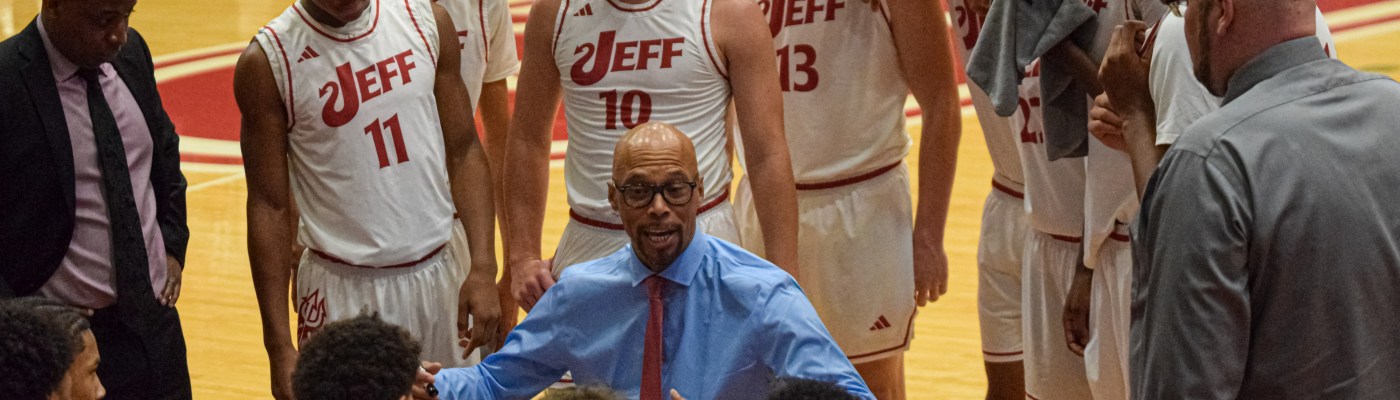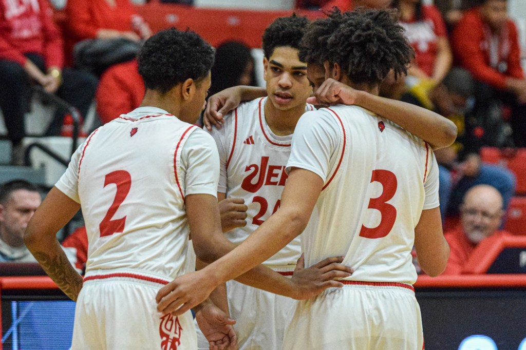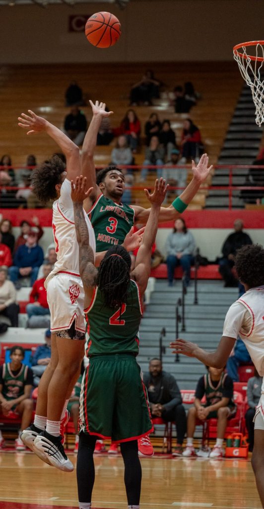 The Red Devils plan out their game plan before the tip off against Lawrence North on Jan. 3. JHS plays at New Albany on Thursday, Jan. 8 at 7:30 p.m. The game was moved from Friday to accommodate the Indiana Peach Bowl game on Friday night. Photo by Malachi Conrad.Junior Jacob Wilkerson takes a mid range jumper during the JHS-Lawrence North game. Lawrence North won 71-53 on Jan. 3. The Red Devils face off with rival New Albany at New Albany High School this Thursday, Jan. 8 at 7:30 p.m. Photo by Parker McCloskey.Sophomore Aiden Toler scores a layup in the first quarter against Lawrence North. Photo by Malachi Conrad. Senior Cash Whitehead protects the ball while looking for an opening during the Lawrence North game on Jan. 3. Photo by Parker McCloskey.Head coach Sherron Wilkerson talks to his team in the third quarter during a timeout. Photo by Malachi Conrad.