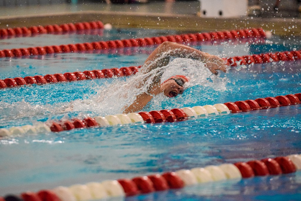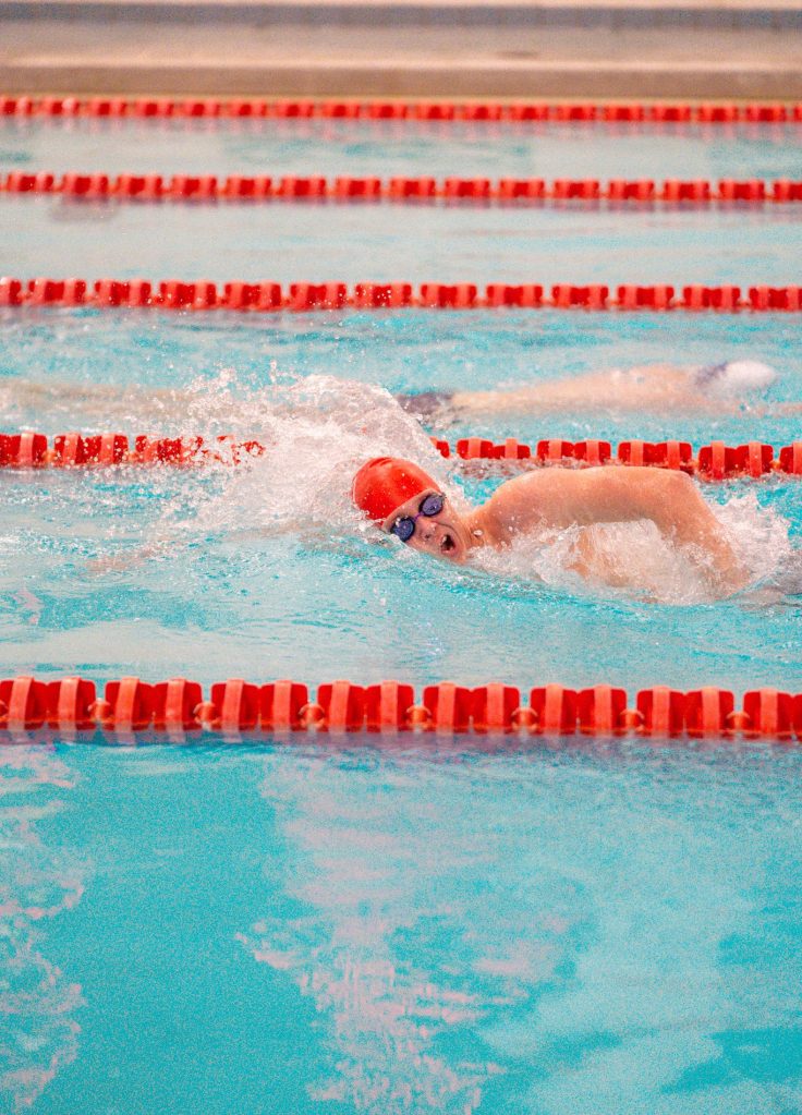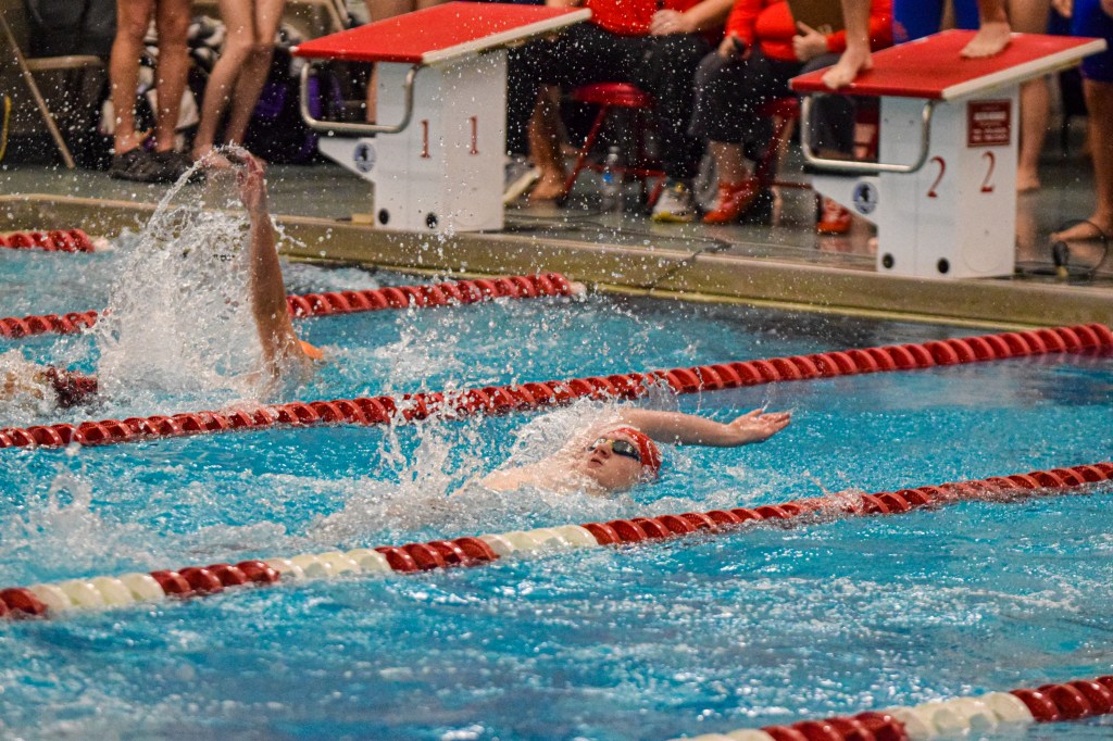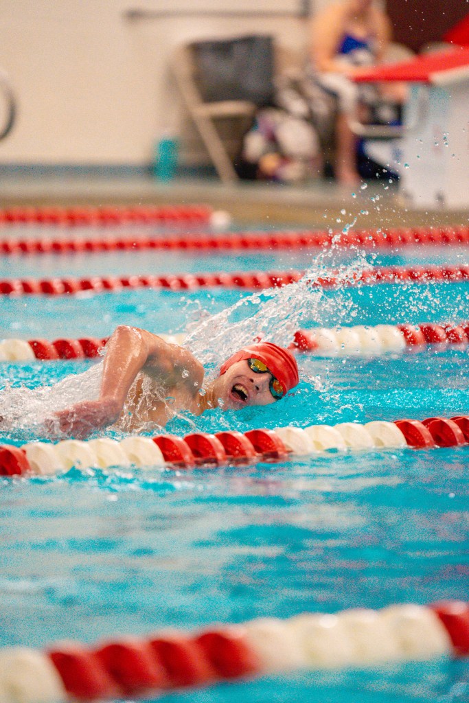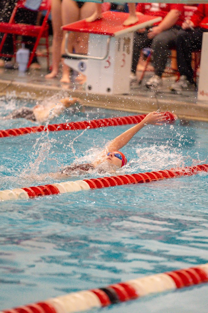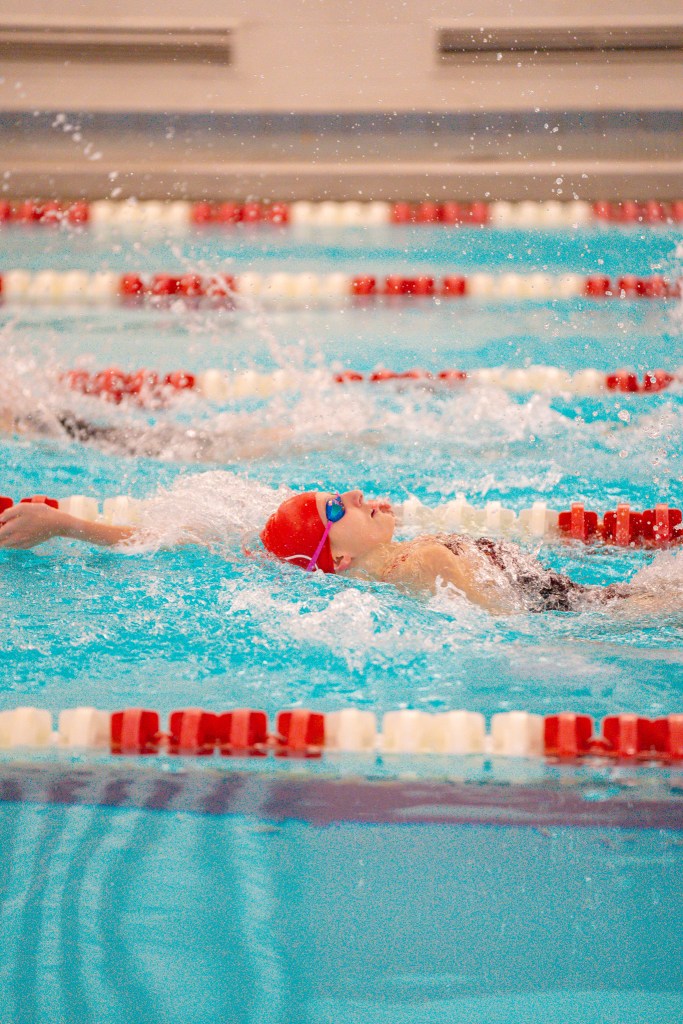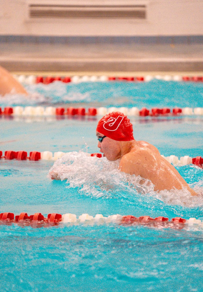 Junior Liam Turk-Gagel swims during the free-style on Saturday, Jan. 10. The Jeffersonville High School Co-Ed Swimming Invitational included multiple Southern Indiana teams. The event recognized alumni in the final high school meet in the current pool before the move to the new natatorium in the fall. Jeff won the event as a team. Photo by Parker McCloskey.Freshman Charlie Frakes does a backstroke technique during Saturday’s swim meet. Photo by Malachi Conrad.Senior Jaga Pagva performs the breaststroke while on a relay. Photo by Parker McCloskey.Senior Jaga Pagva swims during the relay at the Jeffersonville High School Co-Ed Swimming Invitational. JHS finished first in the meet on Jan. 10. Photo by Malachi Conrad. Freshman Brandon Rubio swims the butterfly in the medley relay on Saturday. Photo by Parker McCloskey. Freshman Dashiel Leonard swims during the free-style at Saturday’s event, designed to honor alumni as part of the final high school meet in the current pool. Photo by Parker McCloskey. Senior Adelaide Bingham performs a butterfly stroke while on a relay. Photo by Parker McCloskey.Junior Macyn Jackson performs a backstroke on a relay. Photo by Parker McCloskey.Junior Macyn Jackson performing a backstroke on a relay. Photo by Parker McCloskey.