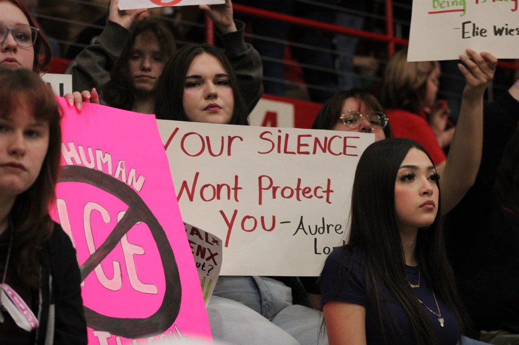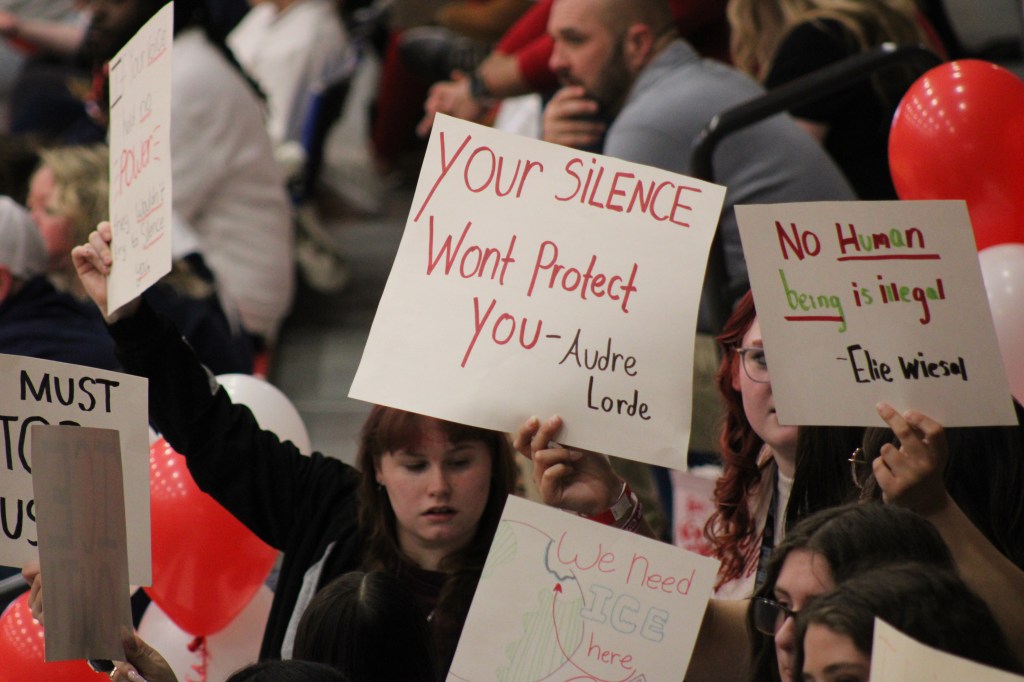 Some students displayed signs protesting ICE during the game