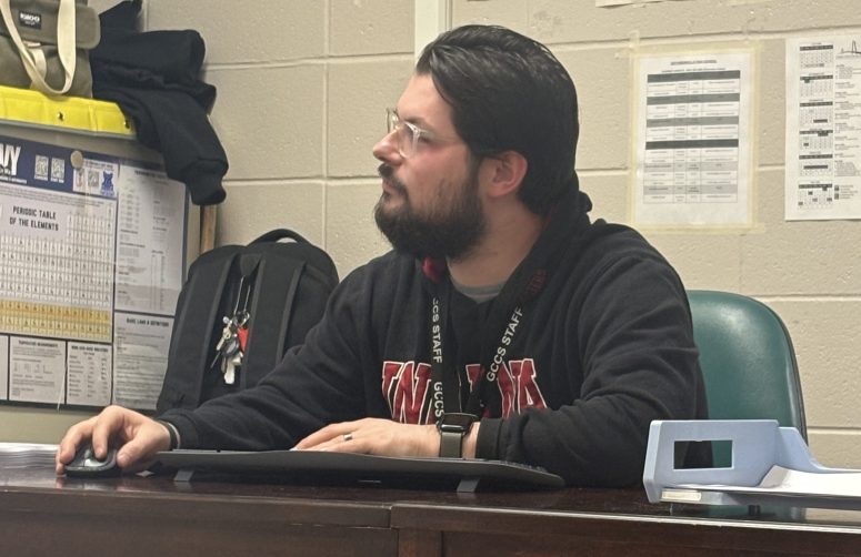 ICP teacher Matthew Bramer goes over student slides and corrects them to put it in a grade. Bramer is happy that the student had finished the work. ”I love being a teacher; I can show them a easy way to do things,” he said. Photo by Kayleen Alvarado.