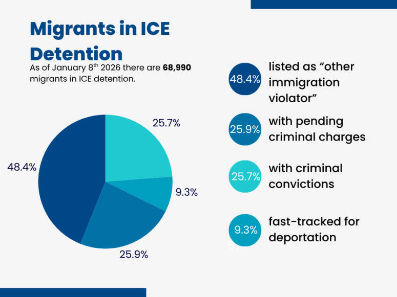 Along with the over 540,000 that have been deported, according to WLRN, as of December 2025, 74% of around 70,000 immigrants in Immigration and Customs Enforcement detention have zero criminal convictions. And yet Trump is still saying he is only targeting criminals when ¾ of the people in detention centers aren’t even criminals.