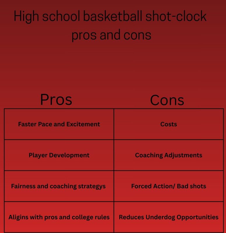 Some cons would be the cost of installing it and maintaining the shot clock, and it requires an extra, trained operator for varsity, and potentially for junior varsity and freshman games.