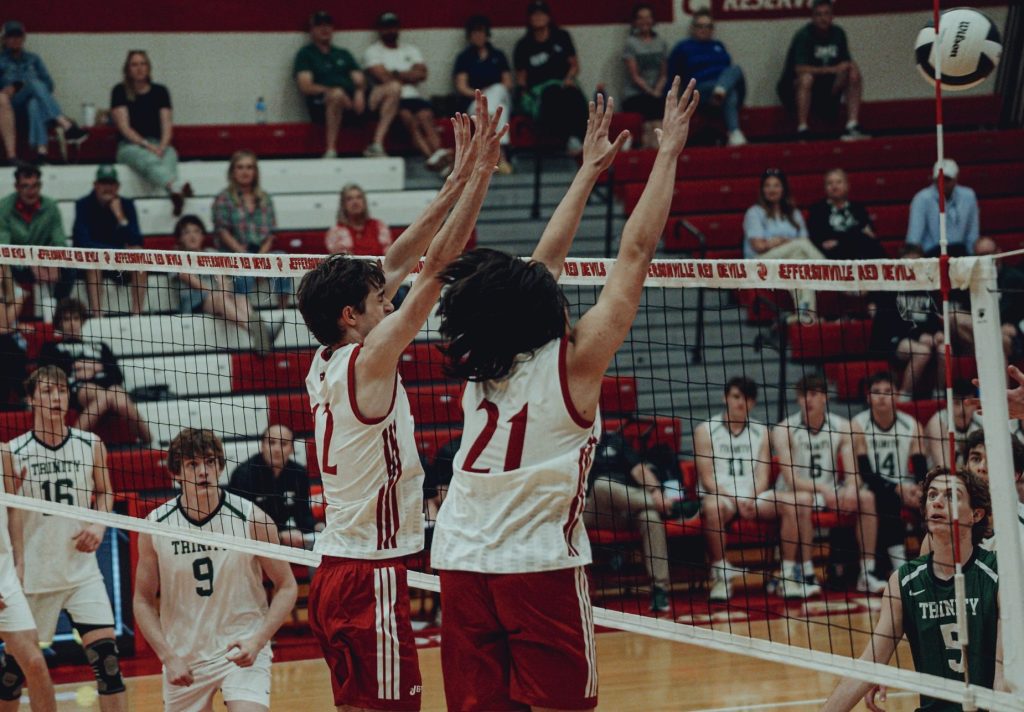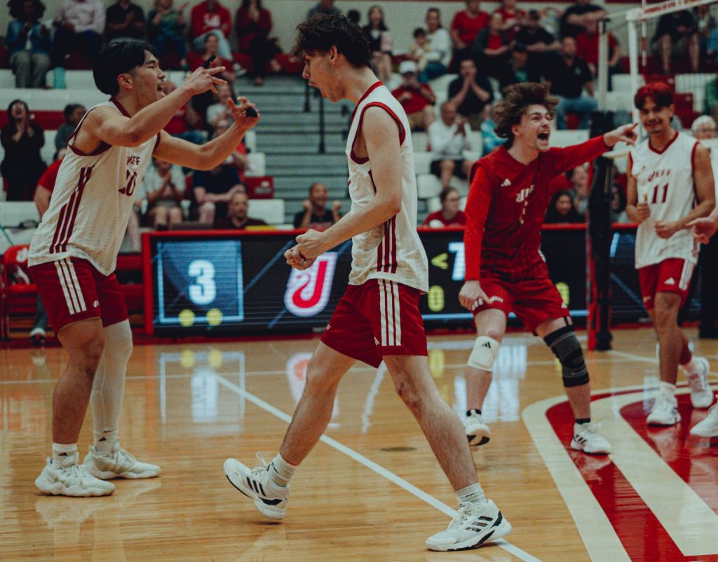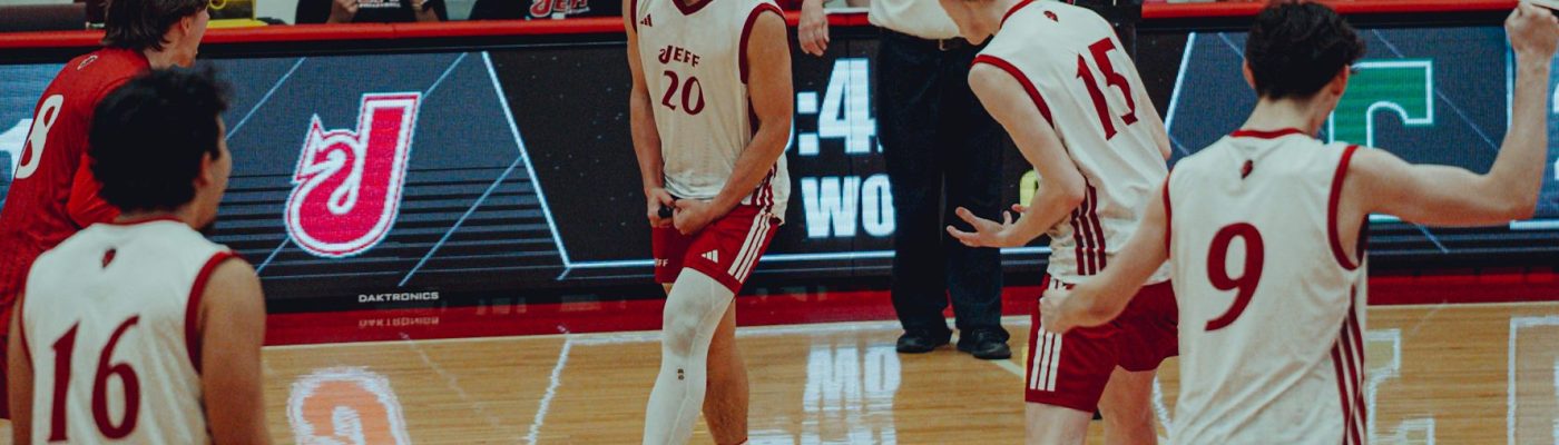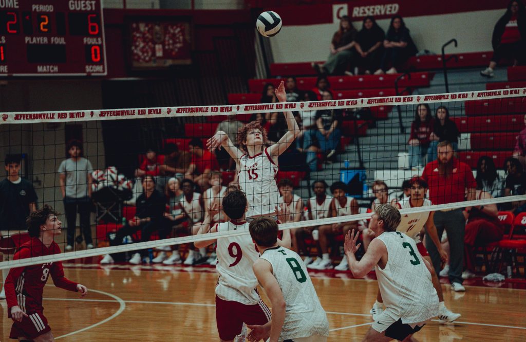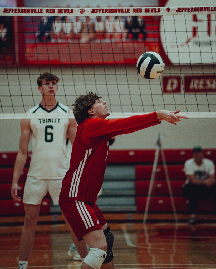 Senior Jordan Rogers celebrates his point over Trinity in the first set. Photo by Malachi Conrad.Senior Malachi Crowder bumps the ball up to prepare an offensive attack. Photo by Malachi Conrad.Sophomore Ryder Lott spikes the ball, going for the kill. Photo by Malachi Conrad.Senior Jake Whobrey and senior Jacob Reed attempt to block the ball. Photo by Malachi Conrad.Senior Joel Ramirez jump serves the ball in the second set. Photo by Malachi Conrad.Senior Anthony Gaunchuluun celebrates his successful kill against Trinity. Trinity beat Jeffersonville 3-1 last night. Photo by Malachi Conrad. Senior Joel Ramirez mentally prepares to serve the ball against Trinity last night. Photo by Malachi Conrad.