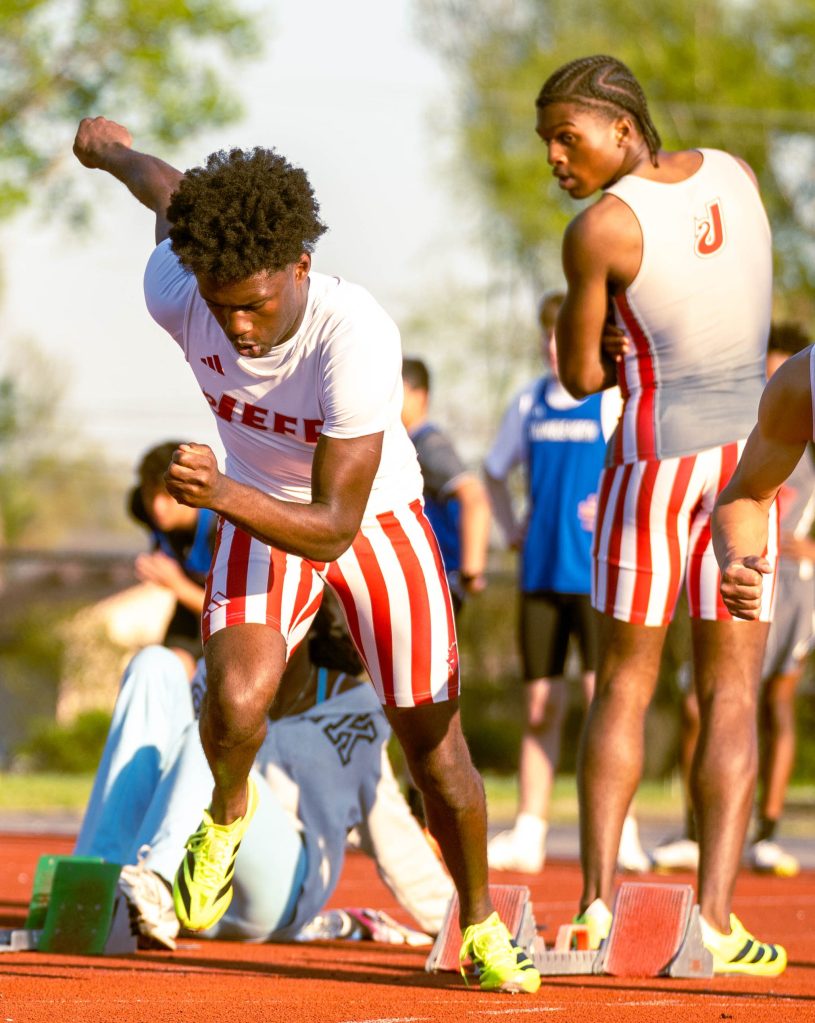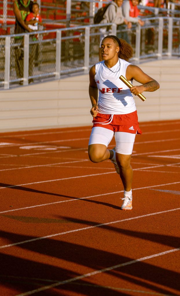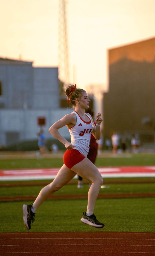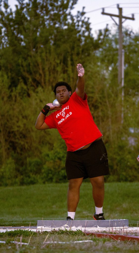 Sophomore Steven Lucas starts off a race for JHS. Photo by Magdalene Conrad. Senior Kelis Dansby finishes off relays for JHS on April 9 against Columbus North. Photo by Magdalene Conrad. Sophomore Andre Walker prepares to start off relays for the JHS track team. Photo by Magdalene Conrad. Senior Keira Jackson runs for the Red Devils during the dual meet against Columbus North on April 9. JHS will compete at New Albany on April 16. Photo by Magdalene Conrad. Junior Jomall Owens makes a throw for the Red Devil track and field team. JHS competed against Columbus North in the dual meet on Thursday, April 9. Photo by Magdalene Conrad.