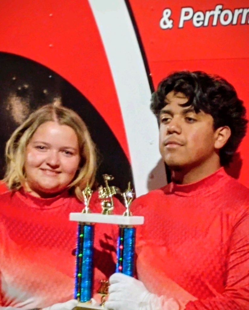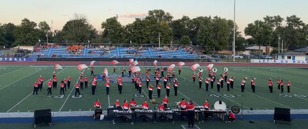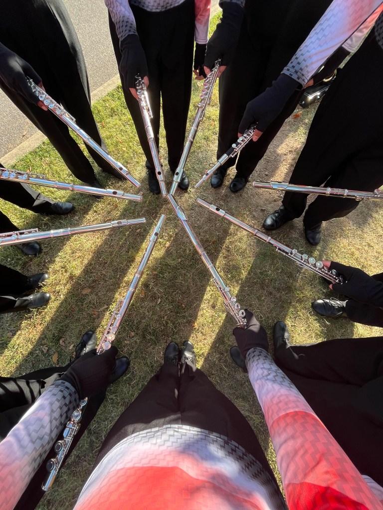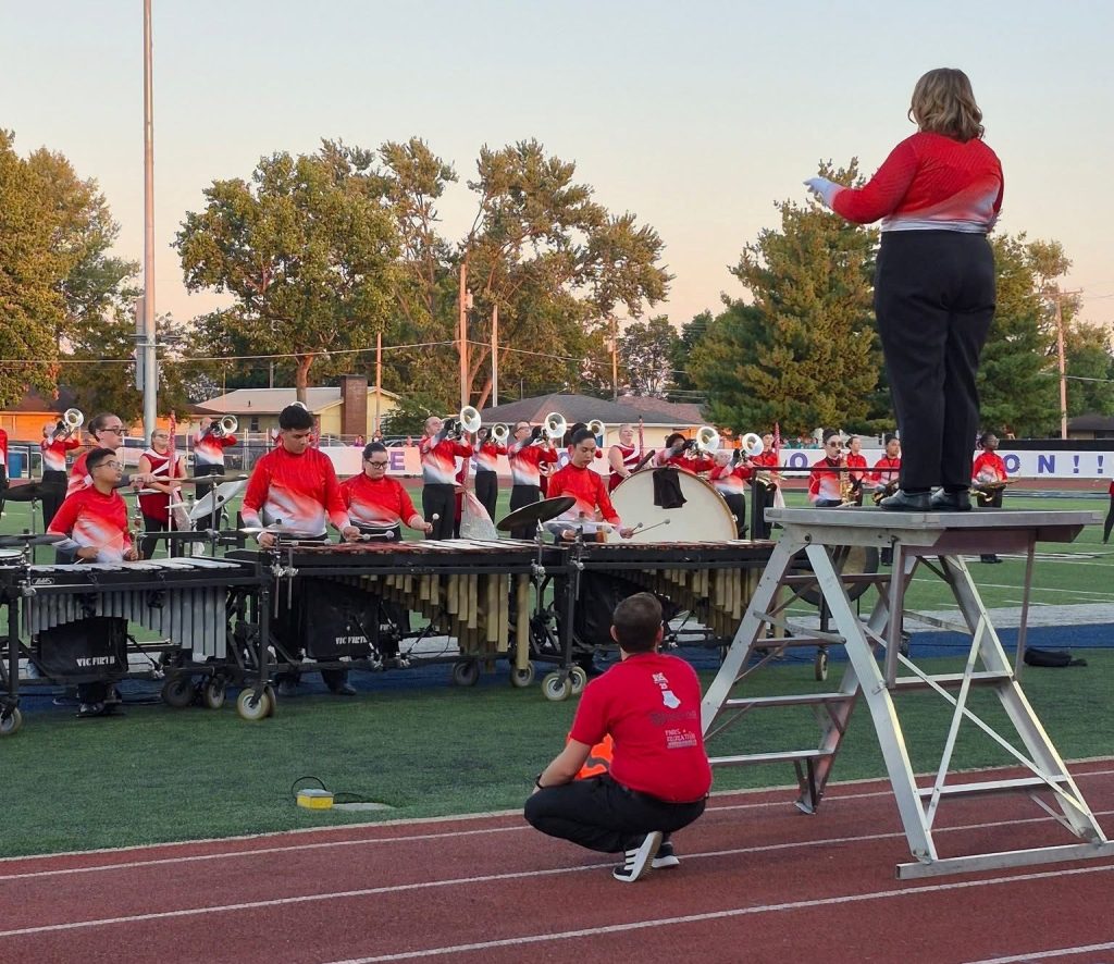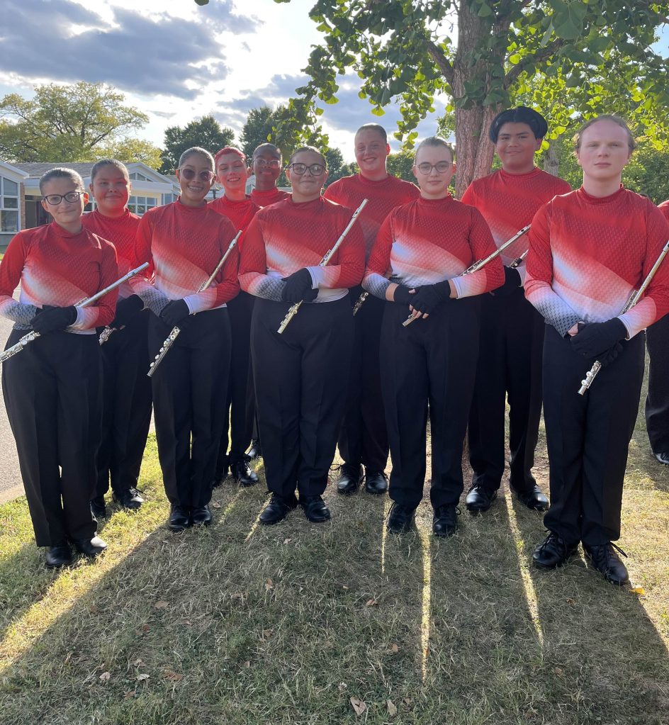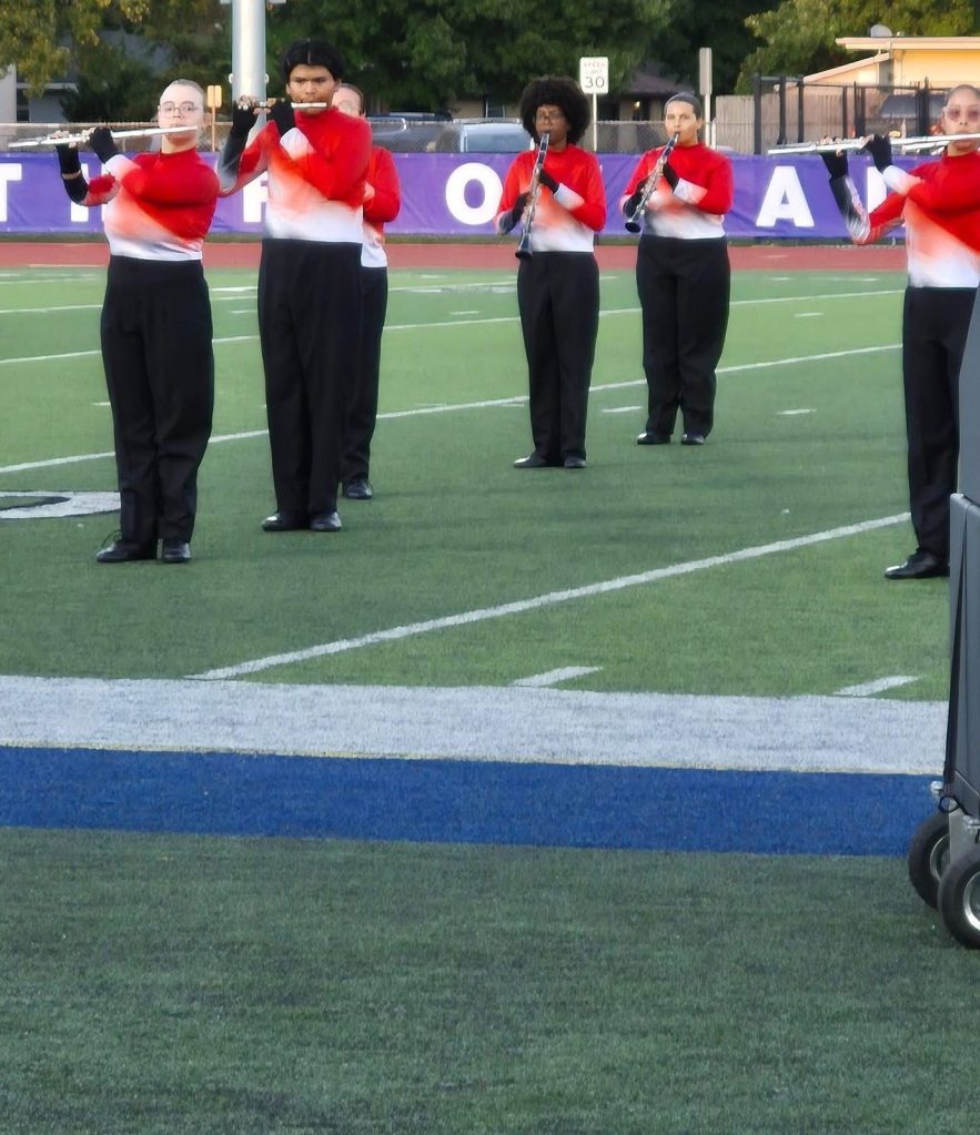 The flute section of marching band prepares for their performance at this weekend’s contest at Columbus North High School. Photo by Kyra Gibson.The flute section of the JHS marching band gathers together just before performing at Columbus North High School. Photo by Kyra Gibson. Senior drum major Alice Haynes conducts the marching band on Saturday at Columbus North High School. This Saturday will compete in Paoli. Photo by Kyra Gibson. The flute and clarinet sections compete on Saturday, Sept. 6. Photo by Kyra Gibson. The marching band performs “Everything In Its Right Place” while competing at Columbus North High School on Saturday, Sept. 6. The JHS band placed third. Photo by Kyra Gibson. Senior drum major Alice Haynes and junior drum major Sebastian Lopez hold the third-place trophy earned by the Jeff High marching band at Columbus North High School on Saturday, Sept. 6. Photo by Kyra Gibson.