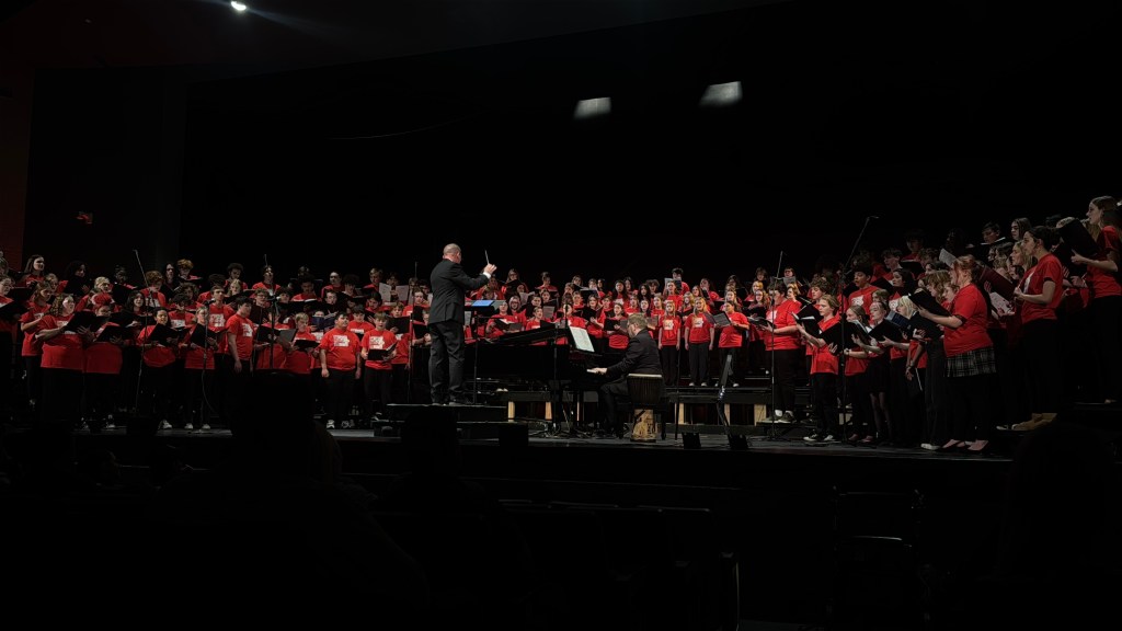 Choir director Kyle Broady speaks to the audience of the Ohio Valley Choral Festival on Tuesday, Feb. 25. This year the festival was held at JHS. Photo by Elliot Swincher.Ohio Valley Choral Festival director Dan Anderson, also the choral director at Center Grove High School, directs all choirs that were a part of the festival, which included JHS choir. Photo by Elliot Swincher. The JHS choir performs with other participating choirs at the Ohio Valley Choral Festival on Tuesday, Feb. 25. JHS was among five choirs that performed at the festival, which also included choirs from Charlestown, Silver Creek, Madison, and Lawrenceburg. Photo by Elliot Swincher.