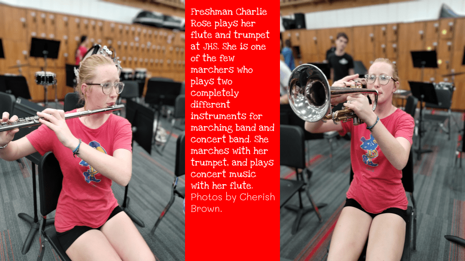 Drums can go from being 16 pounds all the way up to 70 pounds with gravity, which can be super difficult. Sousaphones weigh about 50 pounds, and all of those weights can be difficult depending on the person and size, with also having the marching around for 6-9 minutes (depending on the show length) while hitting all of the visuals and drill spots and playing all of the music by memory. That is a lot of expectations for high school musicians.
