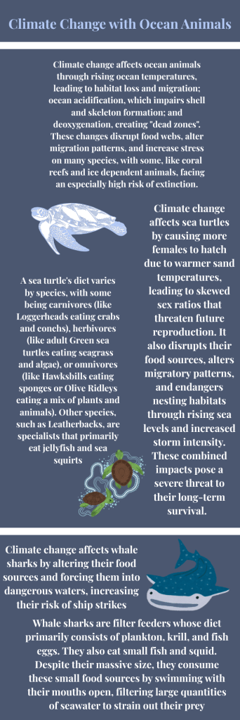 Climate change affects ocean animals through rising ocean temperatures, leading to habitat loss and migration; ocean acidification, which impairs shell and skeleton formation; and deoxygenation, creating “dead zones.” These changes disrupt food webs, alter migration patterns, and increase stress on many species, with some, like coral reefs and ice dependent animals, facing an especially high risk of extinction.