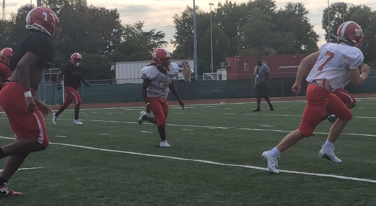 The JHS varsity team practices drills. Players were separated into offense and defense. The Red Devils will play New Albany this Saturday at 11 a.m. Photo by Ifrah Daber.