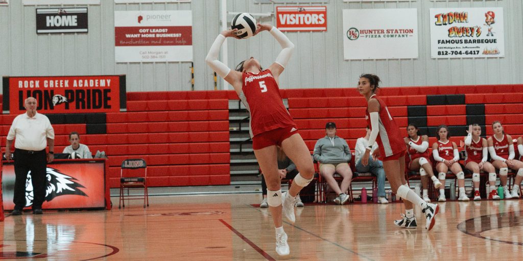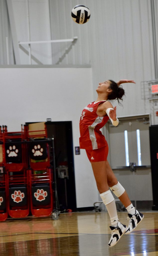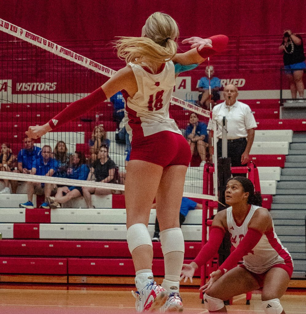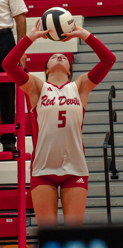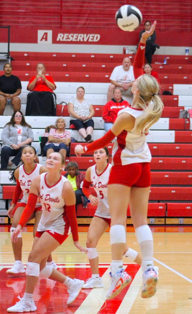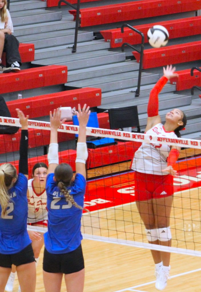 Senior Riley Dobson takes her first serve of the season on the Jeff volleyball court. And tonight, she and her Red Devil teammates battle New Albany in sectionals.